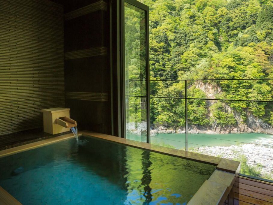 黒部峡谷の雄大な自然に抱かれた宇奈月温泉「延楽」は、樹齢400年もの檜造りの露天風呂「華の湯」が自慢の宿です。宮大工たちが額縁に見立ててこしらえた浴場は、峡谷の絶景を切り取り、日本有数の透明度を誇るお湯が湯鏡となって季節のうつろいを映し出します。なんとも風雅な空間が日々の疲れを癒やしてくれるはず。