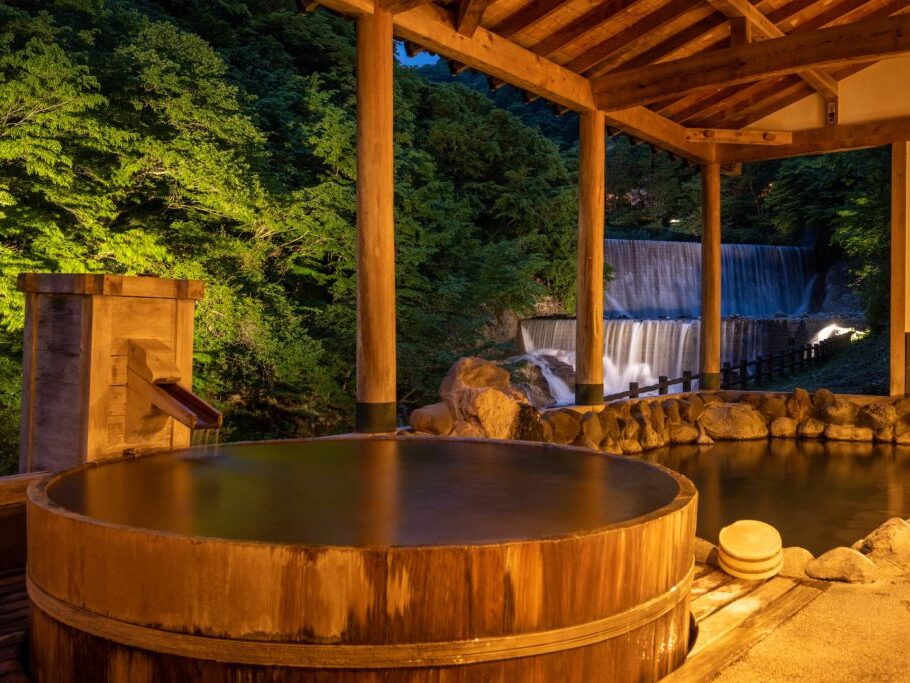毎分約260リットルと豊富な湯量を誇る温泉露天風呂からは、勢い良く流れ落ちる清流・荒川二段の滝を一望。まさに「食べて、飲んで、眺めて」―。水の恵みを全身で体感できます。