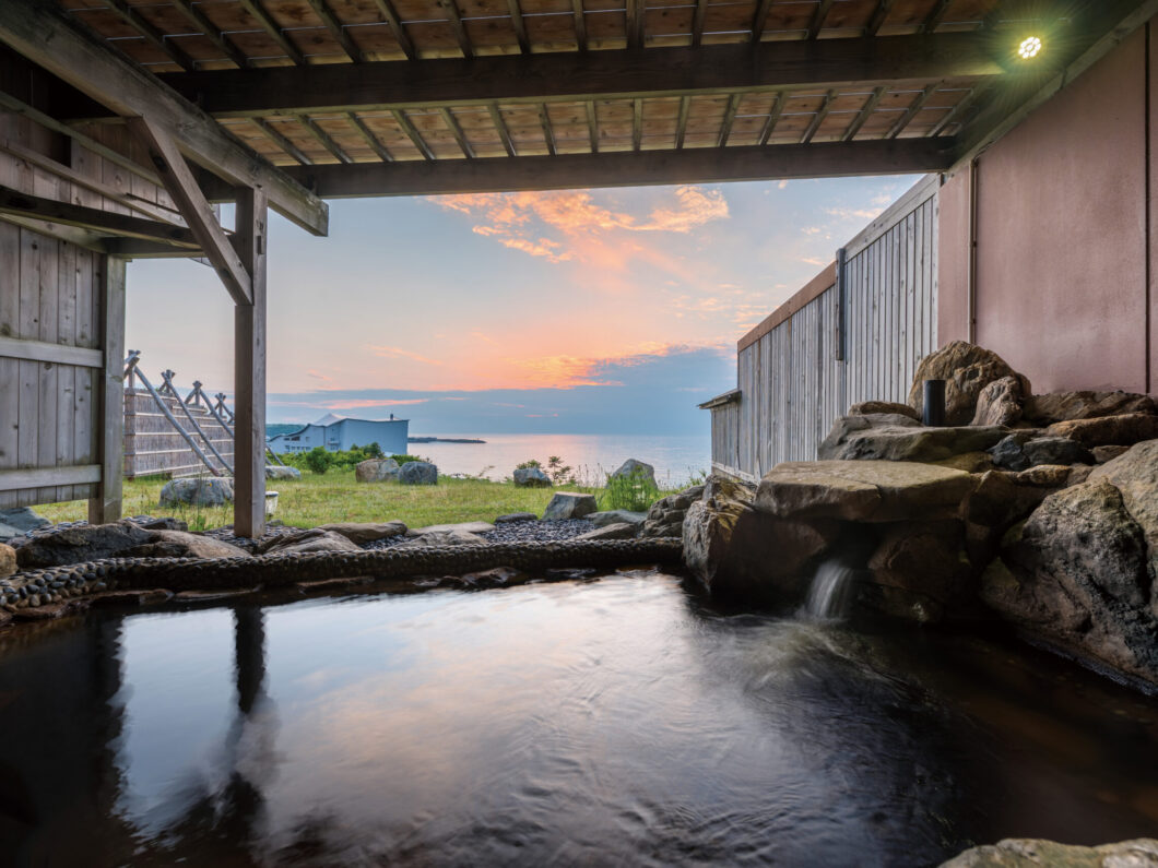 同様の化石海水を含んだ温泉が楽しめるのが、兵庫県日和山温泉の一軒宿「ホテル金波楼」だ。ホテル眼下の日和山海岸は日本海の形成中~形成後の火山活動などによりもたらされた溶岩類や火砕流堆積物からなる磯浜で、海岸西部には流紋岩の大岩壁が屹立している。山陰海岸ジオパーク特有の景勝だ。大地からの恵みは2万年前の地層から湧出する化石海水。高濃度のナトリウム成分で一度身体が温まると温浴感が長続きするため「熱の湯」という別名もある。