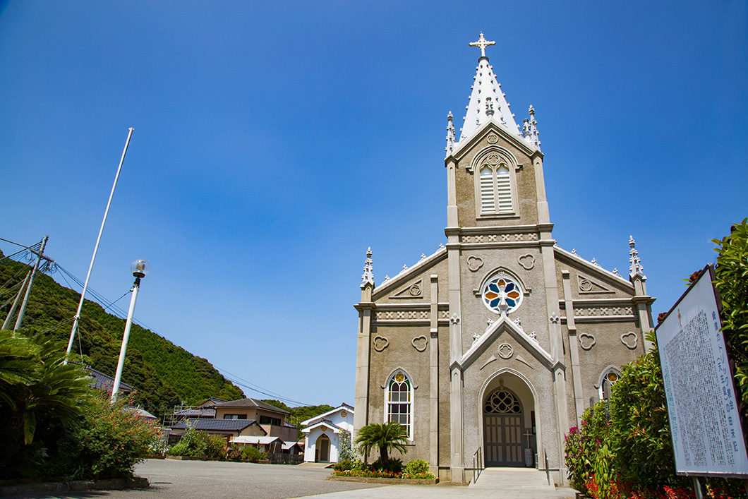 島原半島まで足を伸ばしたら、ぜひ世界文化遺産「長崎と天草地方の潜伏キリシタン関連遺産」観光へ。おすすめはレンタカー(島鉄レンタカー・要予約)だ。南島原では島原・天草一揆の最後の籠城戦となった「原城跡」へ。本丸には民家の石垣に埋もれていた天草四郎の墓石が移されている。南蛮船来航の地であり、キリシタン布教の根拠地だった口之津港から島鉄フェリーで海を渡れば約30分で天草下島の鬼池港に着く。まず向かいたいのがロマネスク様式の大江教会、そしてキリシタン弾圧のための絵踏みが行われた地に建つ世界文化遺産「崎津集落」。漁村の中に佇む教会や歴史を感じさせる神社、風情ある家々など心落ち着くひとときが過ごせる。爽快なドライブを楽しみながら天草瀬戸大橋を渡れば天草上島、そして天草五橋を渡れば天草四郎ミュージアムのある大矢野島だ。