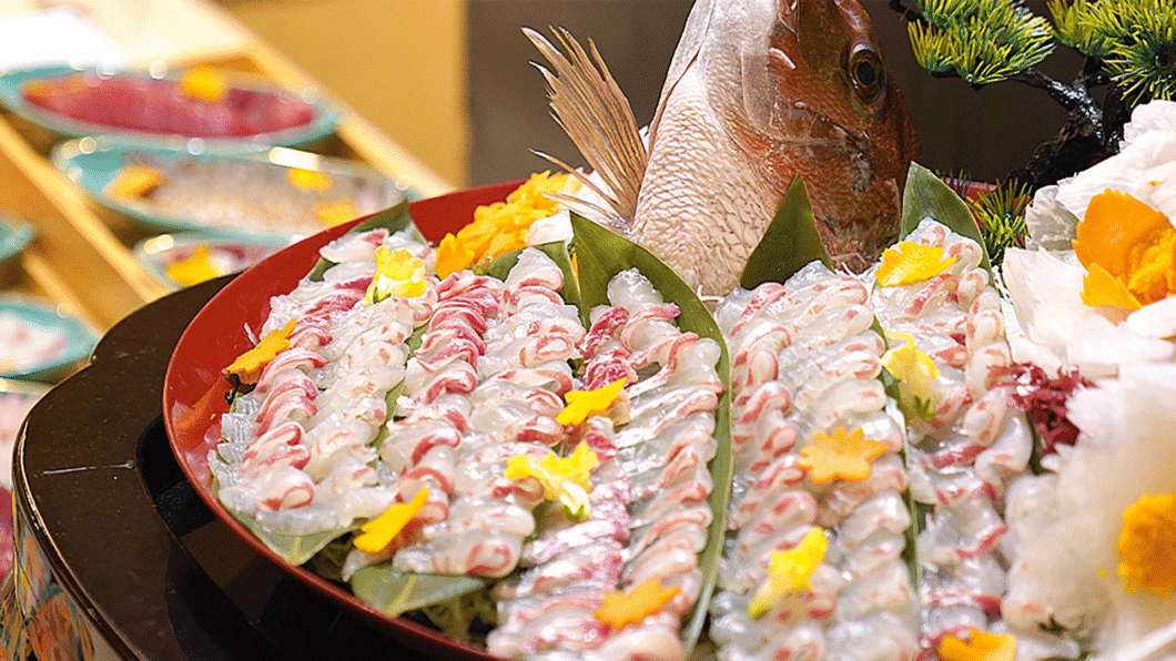 和歌山を代表する高級魚に「クエ」がありますが、当館ではこのクエを名物料理として皆様にご提供しています 。バイキングレストランでは、お一人様用のクエ鍋を年間通じてお楽しみいただけます 。また、懐石料理では、なかなか熱々の状態でお出しするのが難しい天ぷらの代わりに、クエをカラッと揚げた唐揚げをお出ししています 。これなら温かいままご提供できますし、お客様からも大変ご好評いただいています 。
