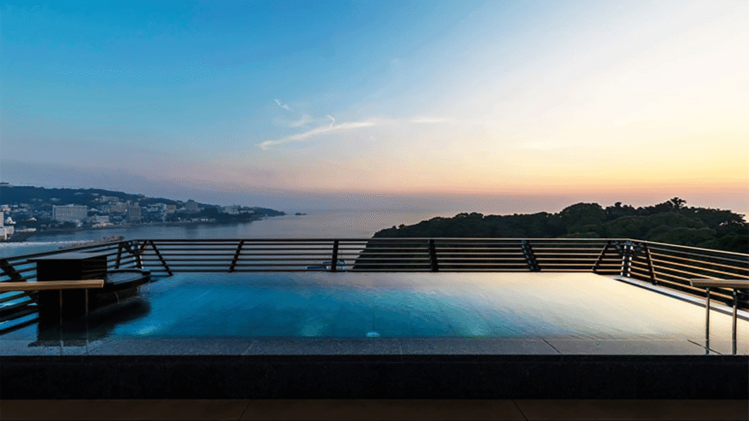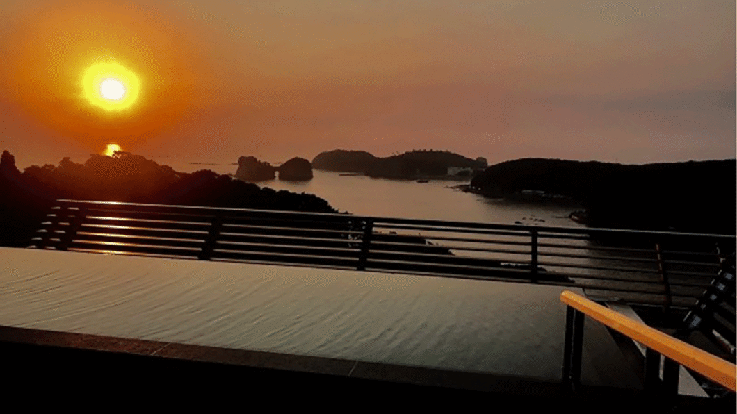 特にサンセットタイムは空が美しく焼けて、格別の景色をご覧いただけます 。この景色を楽しみに、何度も訪れてくださるお客様もいらっしゃいます 。男女の暖簾は朝晩で入れ替わりますので、ご宿泊いただければ両方の景色をお楽しみいただけますが、夏場は円月島側に夕日が沈むため、日没の時間帯は特に美しいですよ 。