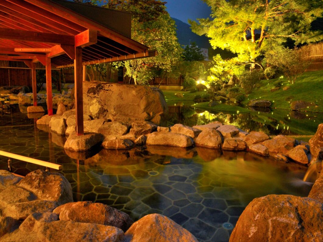 露天風呂は、庭園を眺めながらゆったりと楽しめる「火あかりの湯」も。1泊の滞在で温泉ざんまいを楽しめます。