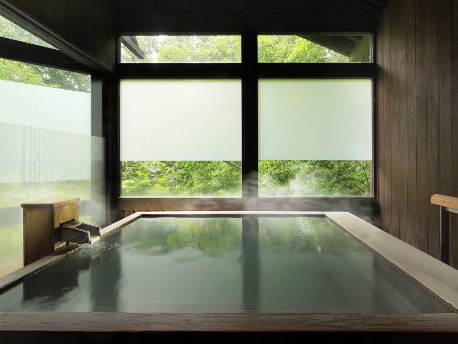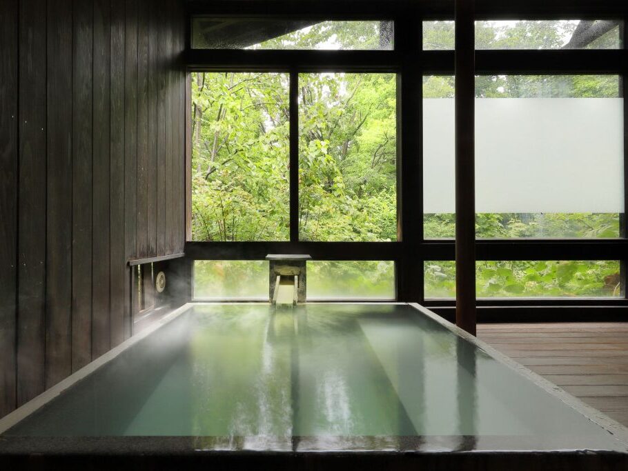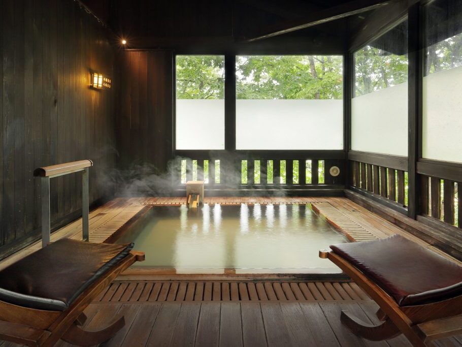 内風呂と露天風呂から成る八右衛門の湯は、硫黄の香りと木の温もりに癒やされ、極上の湯浴み体験に浸れます。