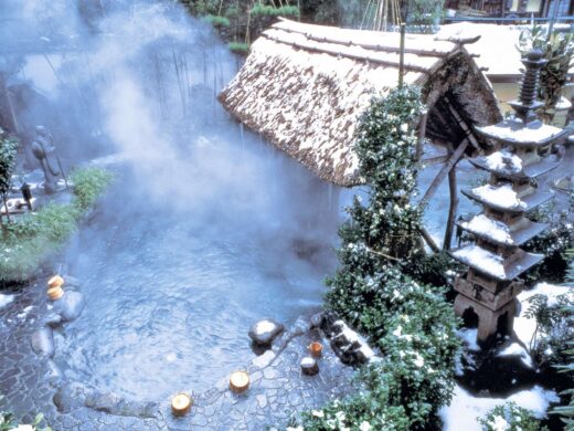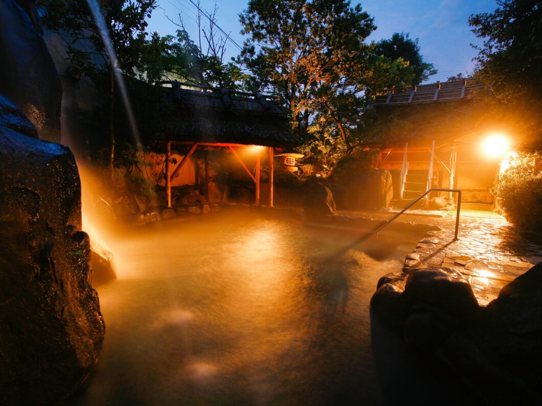大浴場、露天風呂は「彦星」「織姫」があり、男女入れ替え制。大浴場はひのきの香りがすがすがしい広々とした湯殿。露天風呂は情緒あふれるわらぶき屋根と大きな水車をしつらえた、豪快さとシズル感が溶け合った空間。樹齢1200年のヒノキを使った浴槽は温泉ファンならずとも、浸かってみたい風呂です。露天風呂から地下に下りると地熱を利用した地熱低温サウナ「夢千代洞」があります。