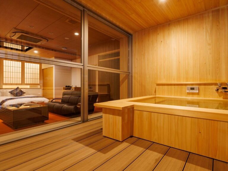湯村温泉の名宿「朝野家」。全客室で楽しめる天然温泉が自慢