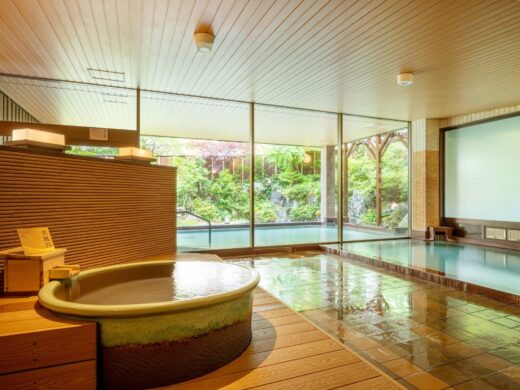 このほか源泉掛け流し露天風呂付き大浴場、オートロウリュウ式サウナを完備。露天や半露天を含む5つの貸し切り風呂などを備えています。