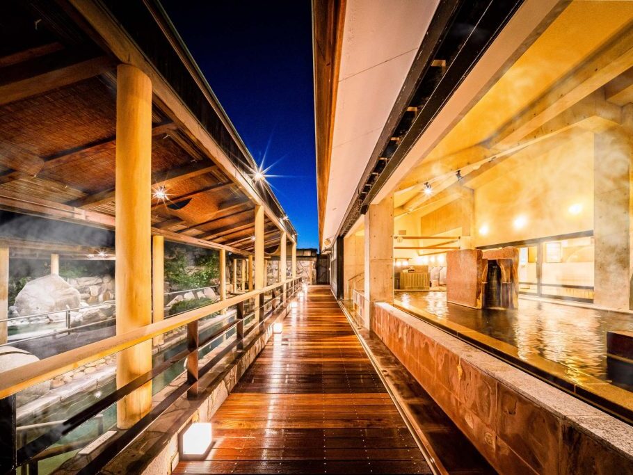 温泉は、2億年前の地層から湧き出る「温まりの湯」、7万5000年前の地層から湧き出る「美肌の湯」の異なる二つの源泉があります。野趣豊かな野天風呂では、歩行浴、寝湯、洞窟風呂など多様な風呂で二つの源泉を楽しめます。