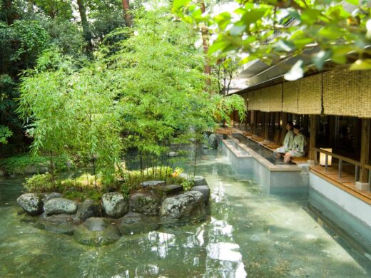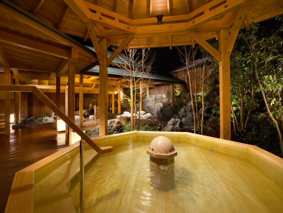 「松ぼっくりの湯」は、八角形のヒノキの湯船と放射状の天井を持つ八角風呂、野趣あふれる岩露天、低温泉、2つの内湯。「ほたるの湯」は、庭園を中心に回廊を巡らせた空間に檜風呂、岩露天、陶器風呂、低温泉、2つの内湯を配置しています。「竹とんぼの湯」はバリアフリー対応の貸し切り風呂で、30人ほどが入れるぜいたくな広さが魅力です。