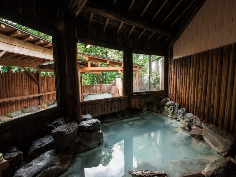 内風呂には源泉を注ぐ「木もれ陽の湯」。岩づくりの浴槽に湯の花が舞う様子が、秘湯を訪れたような雰囲気だと評判なんです。その木もれ陽の湯の隣には、沸かし湯を注いだヒノキ造りの浴槽「ひのきの湯」も。蔵王温泉は国内で2番目に酸の強い、強酸性の温泉。源泉と沸かし湯に交互に入ったり、ひのきの湯を上がり湯として使ったりするなど、さまざまな入り方ができるのが楽しみです。