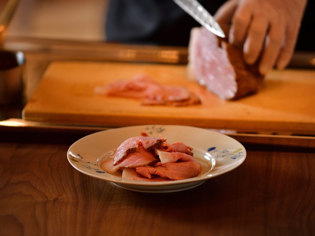 魚沼の銘柄豚「妻有ポーク」を味付けし、68度の温泉熱で3時間、低温調理した「湯治豚(とうじぶた)」は、目の前で切りたてをサービスするちとせのスペシャリテ。とろけるような柔らかさは一食の価値アリ!
